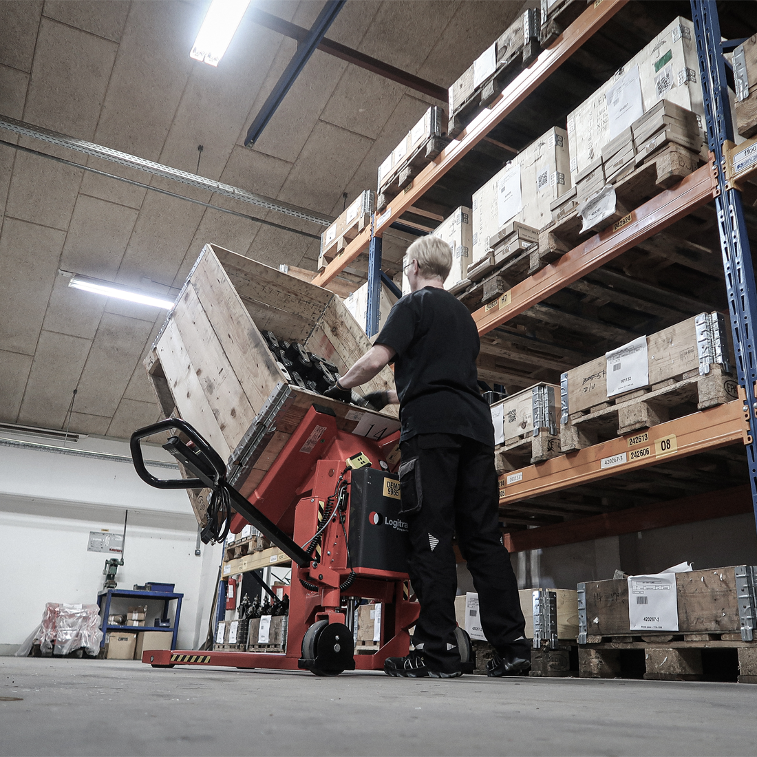 The Logitilt can tilt boxes and crates up to 90º. The user does not have to bend down or stretch up to reach the items in the bottom of the crate or box - this applies both to standing and sitting work positions.