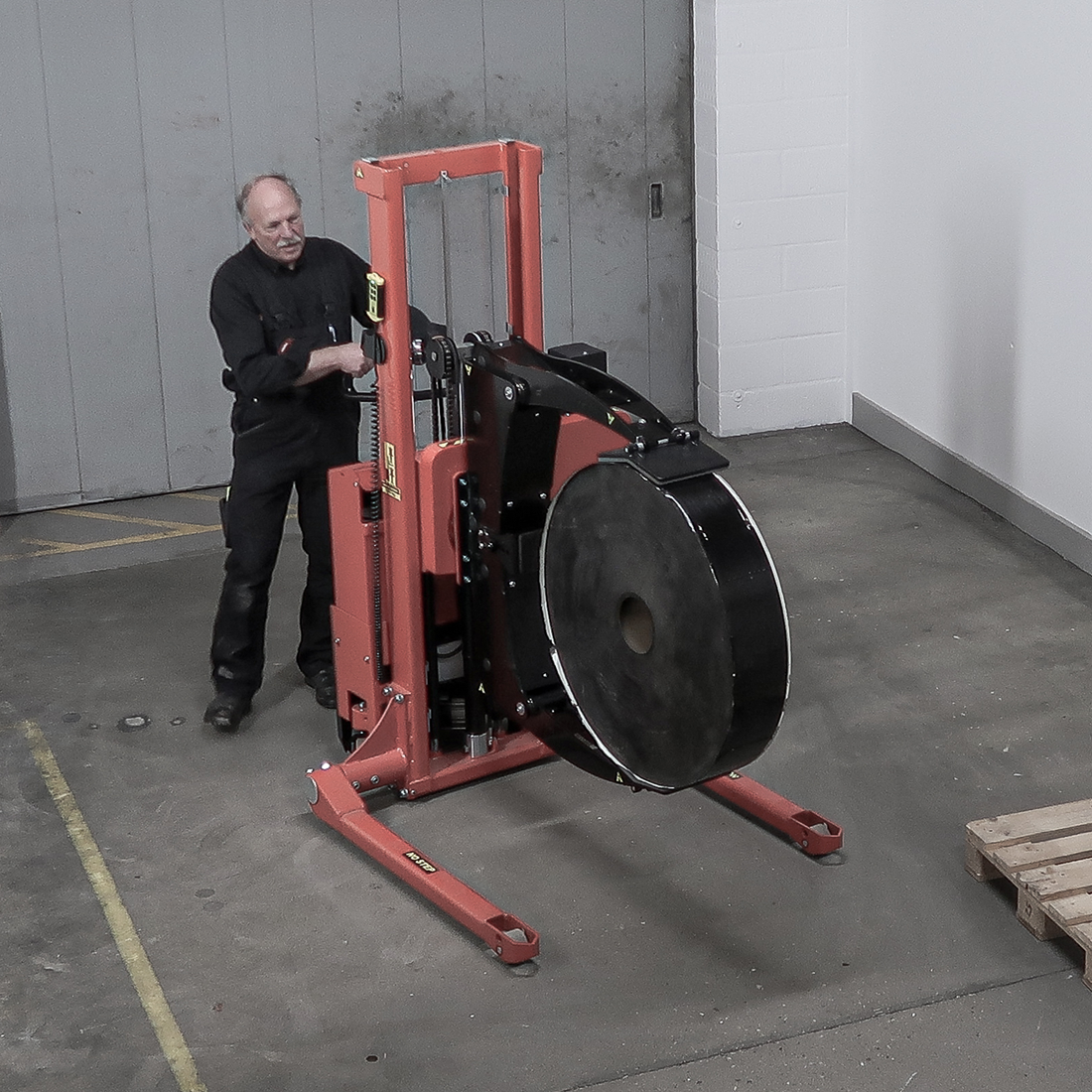 If you need to lift and rotate heavy reels, e.g. placed on closed pallets, the manual reel rotator with straddle legs might be the right solution for you. It can grab and place reels placed on all types of pallets.