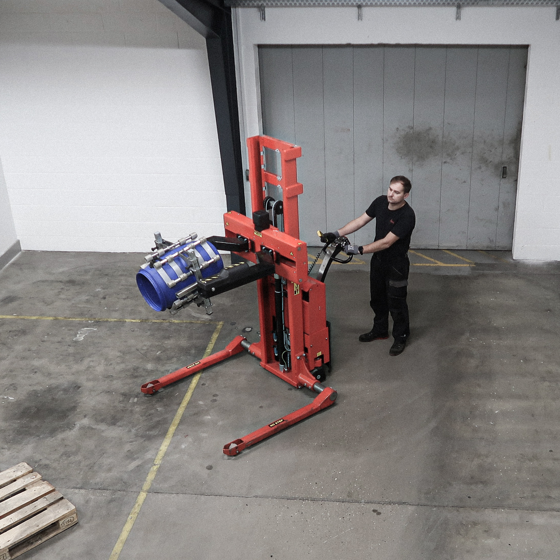 Rotation and opening/closing of the gripping arms, and the lifting and lowering function, are electric. The Multi drum turner can be fitted on both the fully powered Logiflex and the electric Logiflex. Both models are available with straddle legs, if the drum e.g. is placed on a closed pallet.